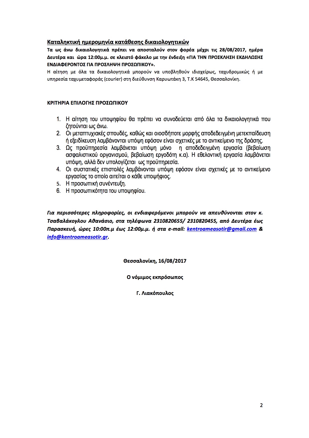 Το Κέντρο Αποκατάστασης Κοινωνικής Στήριξης και Δημιουργικής Απασχόλησης προκηρύσσει τις κάτωθι θέσεις απασχόλησης.